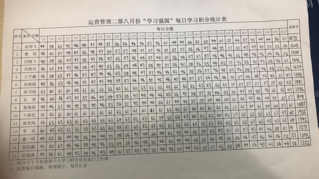 ▲ 運營管理二部員工“學(xué)習(xí)強國”日積分統(tǒng)計