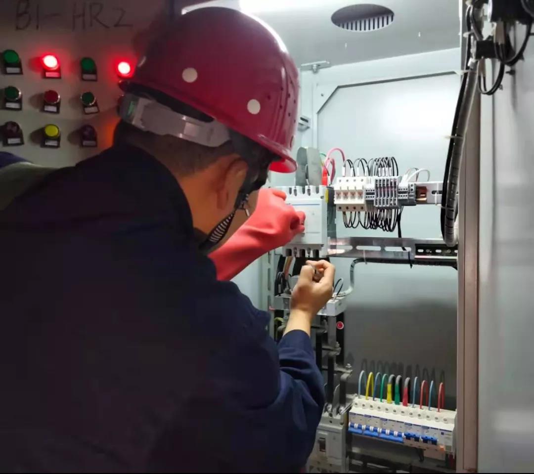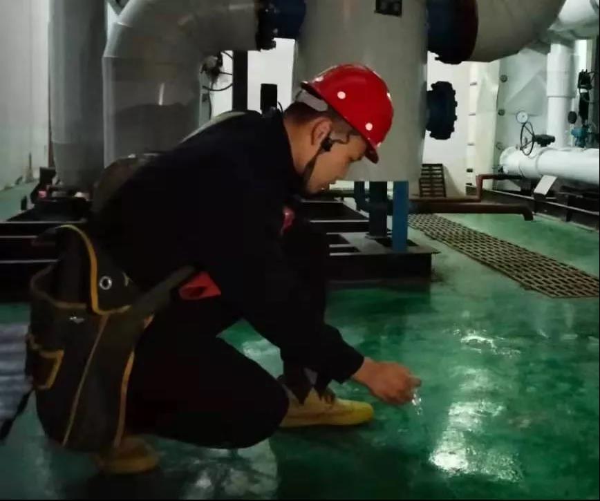 演練正式開始。按照事前部署,管理員趙飛在巡查換熱站時,打開換熱站門,發(fā)現(xiàn)地面有積水,排除自來水泄露原因,趙飛立刻判定是設(shè)備某處漏水。他快速穿戴好絕緣裝備,掏出工具包中的電筆,檢測地面和配電柜是否存在漏電隱患。隱患排除后,趙飛打開站內(nèi)照明設(shè)備,機動組人員進入站內(nèi)排查漏水原因。