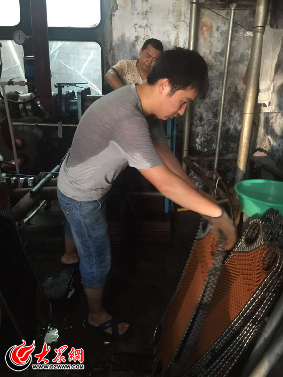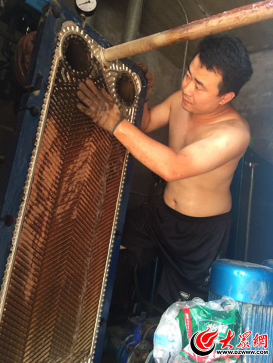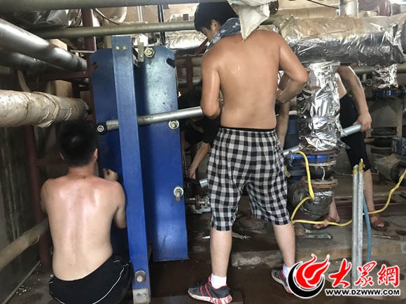 下午4時左右,大眾網(wǎng)記者來到位于丹陽路上的國稅局家屬院。家屬院角落處的供熱設(shè)備機房內(nèi)悶熱狹小,空氣流通不暢,大眾網(wǎng)記者剛進(jìn)去一小會就已經(jīng)汗流浹背。正在清洗換熱器的供暖管理員們有的光著膀子作業(yè),身上水光锃亮,有的脖子上掛著毛巾,但沒過幾分鐘剛在水管洗凈擰干的毛巾又已經(jīng)滿是汗水。